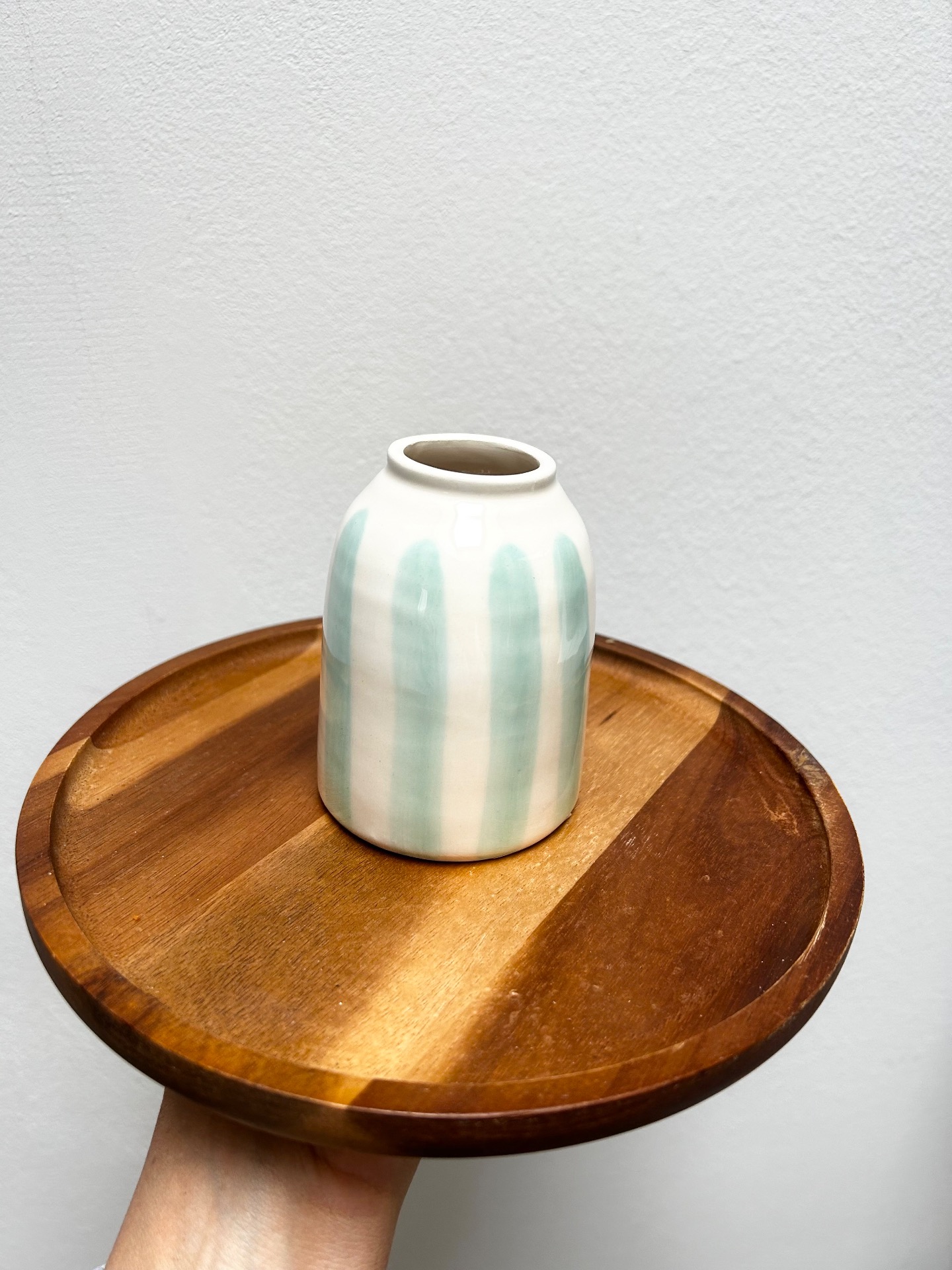 Okouzlující malá váza s vodově modrými pruhy, ideální pro malou kytici nebo několik stonků sušených květin.